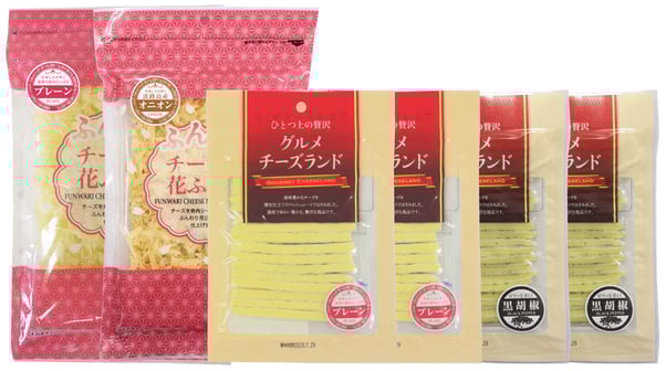 ぐるめチーズサンド プレーン 50g×2袋、ぐるめチーズサンド 黒胡椒 60g×2袋、ふんわりチーズの花ふぶき プレーン 38g×1袋、ふんわりチーズの花ふぶき オニオン 32g×1袋 |