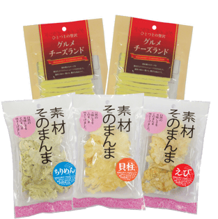 素材そのまんまちりめん4g×1 素材そのまんま貝柱4g×1 素材そのまんまえび4g×1 チーズサンドプレーン50g×2 |