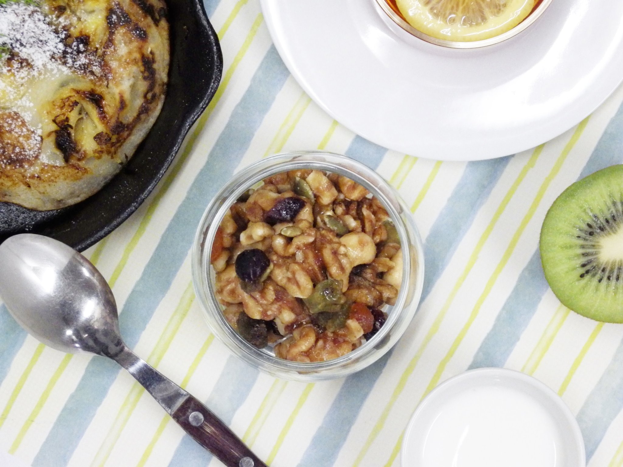 6種類のナッツ、ドライフルーツをブルーベリーの香りで仕上げました。朝食やティータイムでお楽しみください。