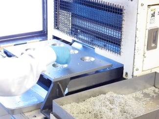 「この特殊なプレス機を使用して海産物で何か作れないか。」というオカベの会長の一声で、開発部の八木さんが中心となり商品開発が行われましたが、プレス機の特性に合う原料探しには大変苦労されたそうです。脂が多いと機械の中ではじけてしまい、旨み成分のアミノ酸が多いと焦げ付いてしまいます。また、冷凍や生では作れず、原料を乾燥した状態でプレス機にかける必要があり、開発に1年以上をかけて、2005年に『そのまんまシリーズ』としてちりめんの他にエビ、イカ、貝柱が商品化されました。